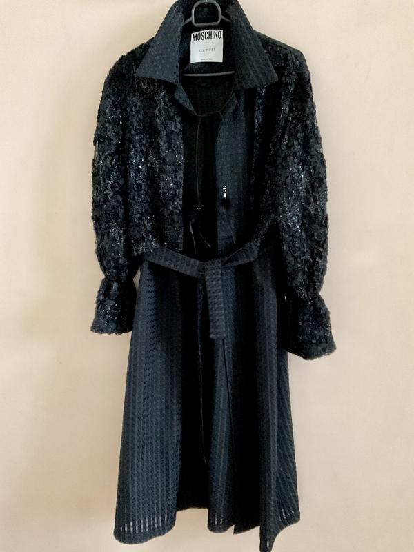 Красивейшее платье оригинал Платье комбинированное , с очень красивым актуальным кружевом Фасон на запах, так же идеально будет смотреться с брюками в качестве кардигана На воротнике шнурки декорированные перьями В идеальнейшем состоянии