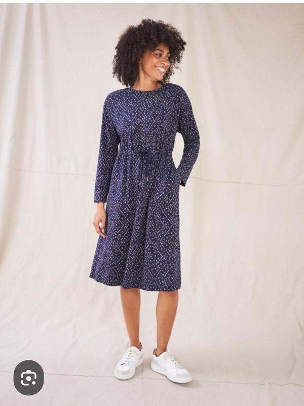 трикотажное платье с боковыми карманами, плечо спущено, талия сзади на резинке, спереди на кулиске, средней плотности, ог 105+, талия 84, об 114+, рукав от ворота 68, длина 104.