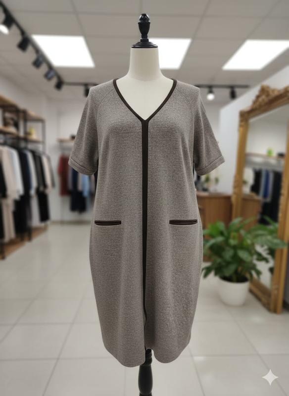Это платье фасона «шифт» (shift dress), выполненное из мягкой фланелевой ткани с добавлением шерсти (состав: 65% полиэстер, 35% шерсть). Основные характеристики модели: Дизайн: серый меланжевый цвет с контрастной черной отделкой по горловине, рукавам и ложным карманам. Вырез: V-образный, подчеркнутый темной окантовкой. Рукава: короткие (длиной 3/4 или стандартной короткой, в зависимости от роста). Детали: два декоративных прорезных кармана («обманки») на передней части Такое платье считается универсальным вариантом для офиса или повседневной носки благодаря лаконичному крою и сдержанной цветовой гамме