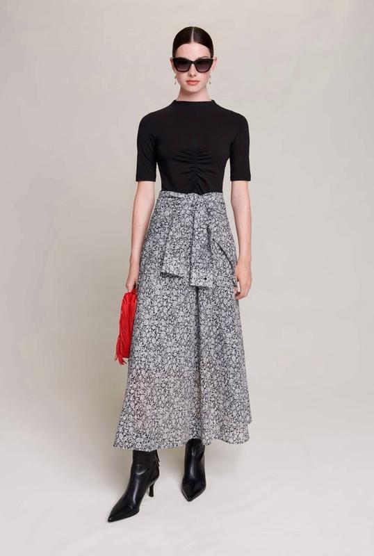 Розмір виробника 38 Заміри: нОг - 42 (тягнеться) довжина - 129 см Стильна сукня в довжині міді Має імітацію підвʼязаної сорочки на талії Верх чорного кольору (тканина трикотаж, як футболка) Поділ сукні напівпрозорий (видно на фото 6,7); має підкладку з такої ж тканини, як і вся спідниця Склад тканини: 71% віскоза; 29% поліамід Верхня частина: 93% бавовна; 7% еластан Стан нової речі, жодних слідів носіння чи прання