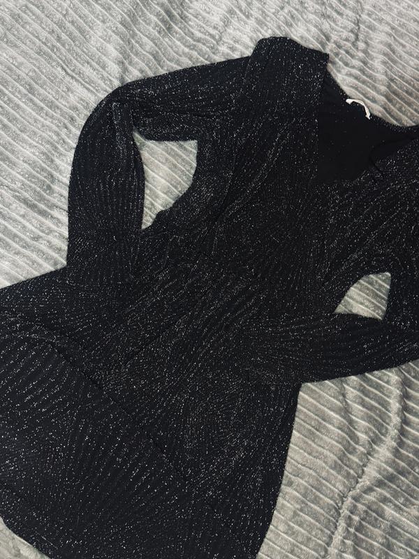 Продаю неймовірно красиве та стильне плаття, яке стане прикрасою будь-якого вечора. Модель виконана з якісного трикотажу чорного кольору, щедро вкритого дрібним срібним шиммером, що створює ефект зоряного неба. Тканина має цікаву текстуру "в рубчик", яка візуально стрункішає.