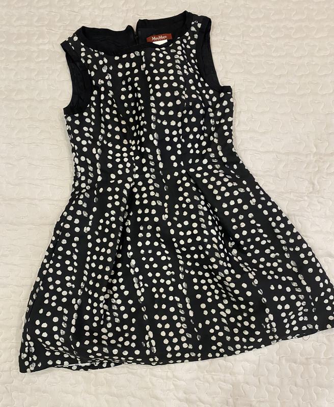 сукня від Max Mara Studio чорного кольору в білий горошок. Основні характеристики: Бренд: Max Mara Studio. Стиль: А-силует (A-line) з приталеною високою талією та спідницею міді. Принт: Білий горошок у художньому або акварельному стилі на чорному фоні. Матеріал: Модель виготовляється з суміші бавовни та шовку l85% бавовни, 12% шовку Деталі: Сукня без рукавів, має круглий виріз горловини та приховану блискавку ззаду. Ця модель вважається елегантною класикою, що підходить як для вечірніх заходів, так і для повсякденного носіння. Відмінний стан Розмір М ПОГ 47 ПОТ 39 Довжина по спинці 82