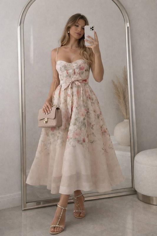 Елегантна сукня міді/максі бежевого кольору з квітковим принтом. Сукня має приталений силует з корсетним ліфом на тонких бретельках і акцентом на талії у вигляді пояса, що зав'язується. Італійський виробник 🇮🇹 Розміри : S ; M ; L Заміри по запиту. Склад: 65% котон, 35% поліестер #6