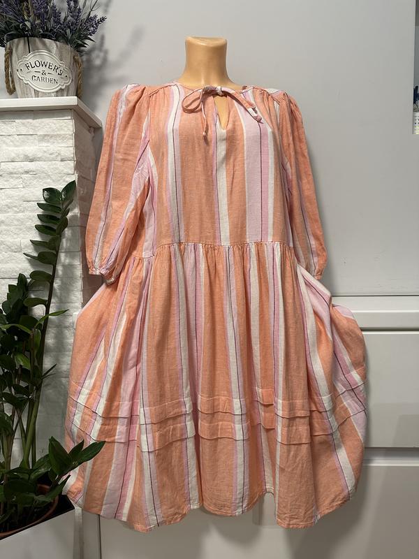 Натуральна смугаста лляна сукня від бренду Marks & Spencer. Тканина в коралово-рожевих та білих тонах, має вільний крій у стилі бохо з ярусним низом та зав'язками на горловині. Р.16,довжина 97,пог60
