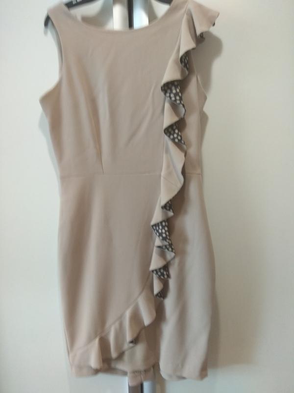 Літнє плаття Jas d'orange, Франція, без підкладки, колір бежевий, волан із зворотного боку темно-синій, в горох. Заміри: ПОГ 45-46 см, ПОТ 37-38 см, ПОБІДИ 45-46 см, довжина 90 див.