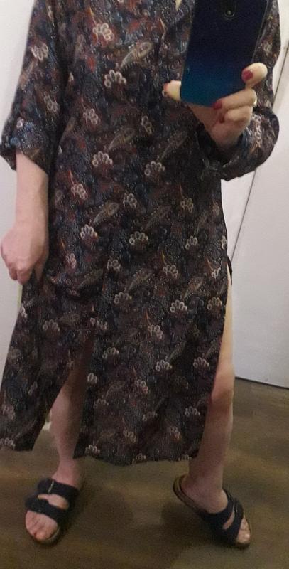 Шифоновое платье-рубашка,размер M-L в огуречный принт,по бокам два глубоких разреза.Состояние нового.