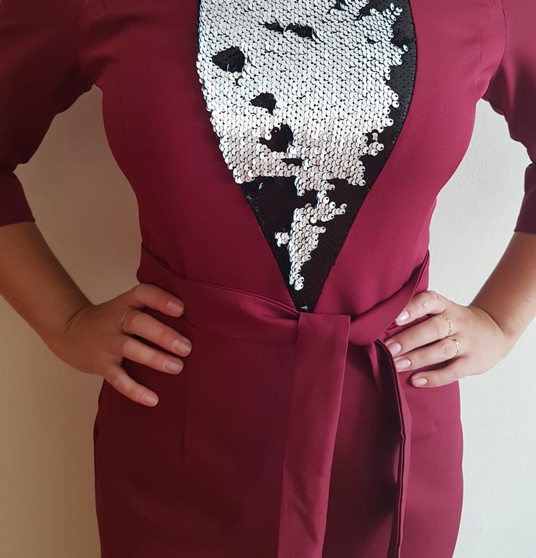 Плаття нове, не одягали, окрім примірки.Насправді є дещо темнішим, аніж на фото. Довжина - міді, проте, за бажання його можна без проблем вкоротити. Паєтки перевертаються зі сріблястого кольору на чорний. На спині потайний замочок. Можна носити без пояса. Підійде на S та на M.