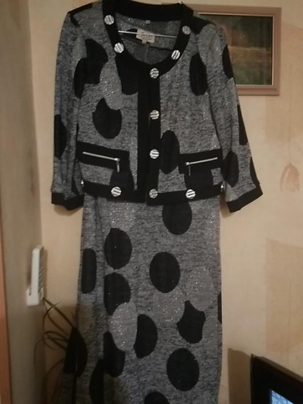 Гарний костюм-двійка. Щільний трикотаж. 30% ангори. Сукня з коротким рукавом. Укорочений Жакет , рукав 3/4. З окремими елементами люрексу. Нарядний і повсякденний.