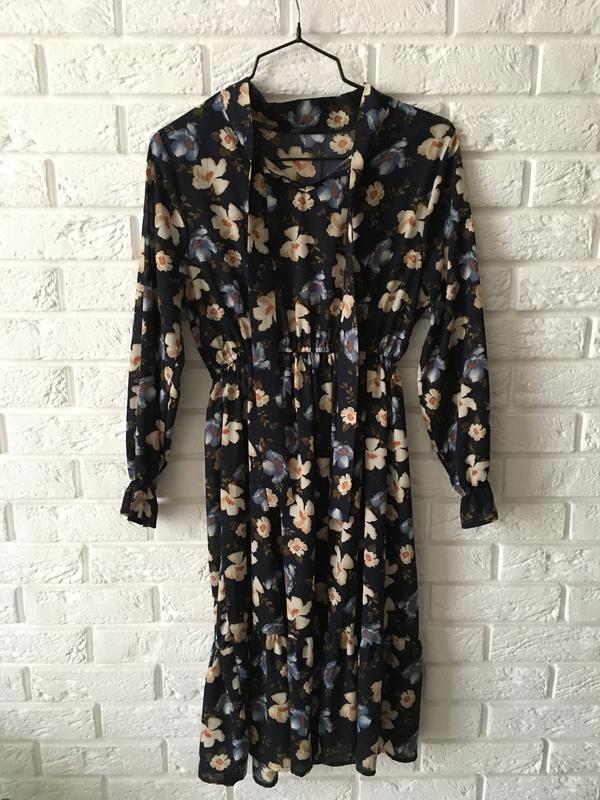 Нове гарне плаття, з осінньо-весняним принтом! Довгий рукав з регланом, спідниця так само закінчується регланом. Довжина сукні 100 див. Комір стійкою з стрічками, який можна зав'язати в бант. Дуже приємна і комфортна тканина! Ідеально підійде як під кеди, так і під туфлі