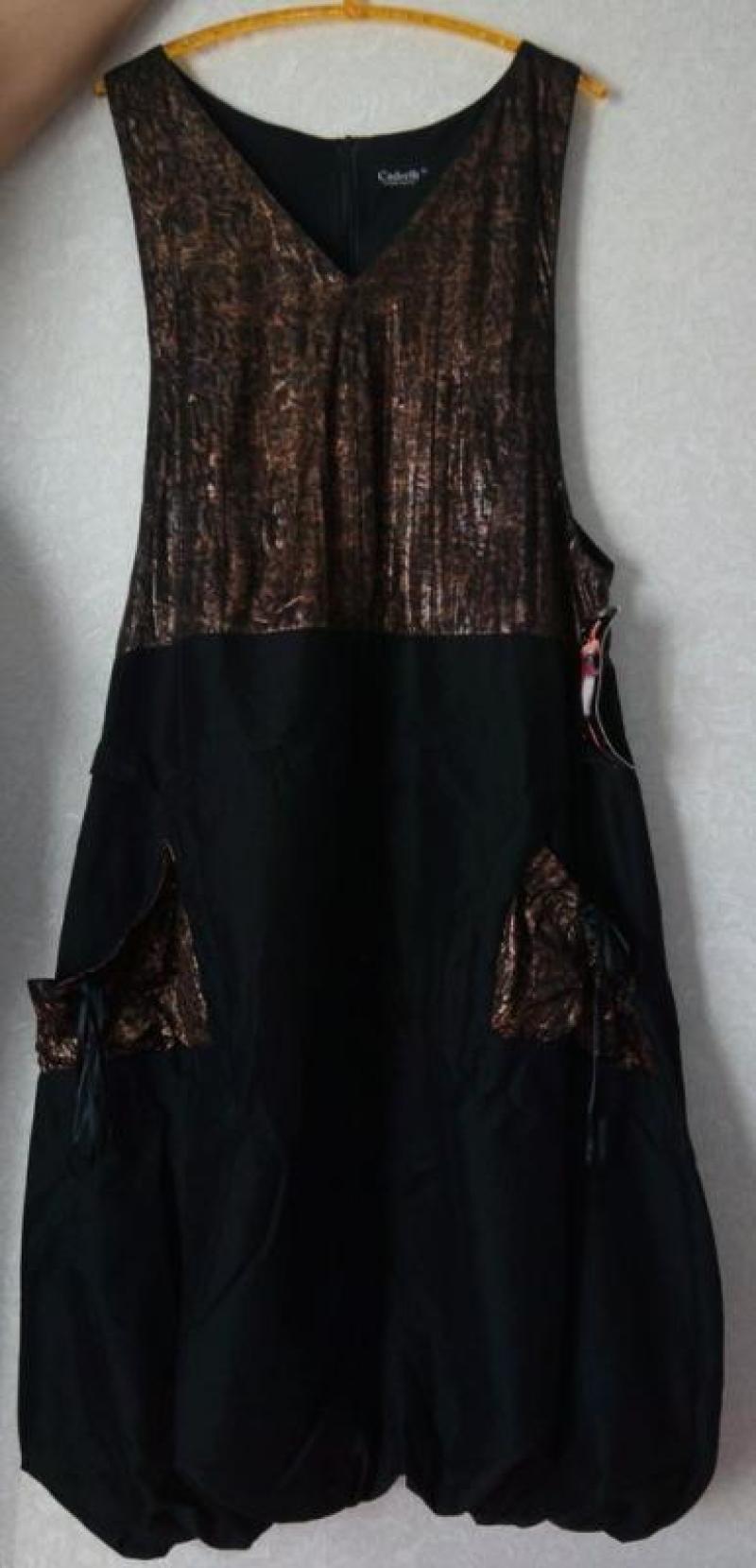 Сарафан з великою проймою рукавів, для поддевания футболки, водолазки і т. п. Висота пройми: -44 см. Ширина по грудях: 40 см Висота майки до з'єднання з спідницею: 52 см. Ширина майки по з'єднанню з спідницею: 56 см. Ширина стегон на рівні кишень: 74 см довжина сукні - 127 див. * На спинці блискавка. Низ сарафана присобран на резинці, з'єднане з підкладкою. Виробник: Туреччина.