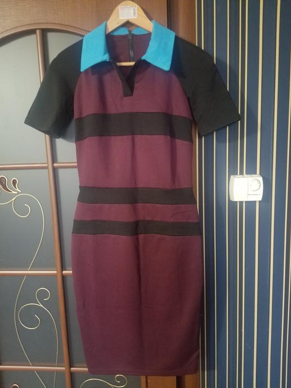 Цікаво плаття-футляр бордового - чорного кольору з бірюзовий коміром, вигідно підкреслює фігуру, ззаду по всій довжині замок. Без бирки, нове. Торг доречний Заміри по запиту Торг доречний
