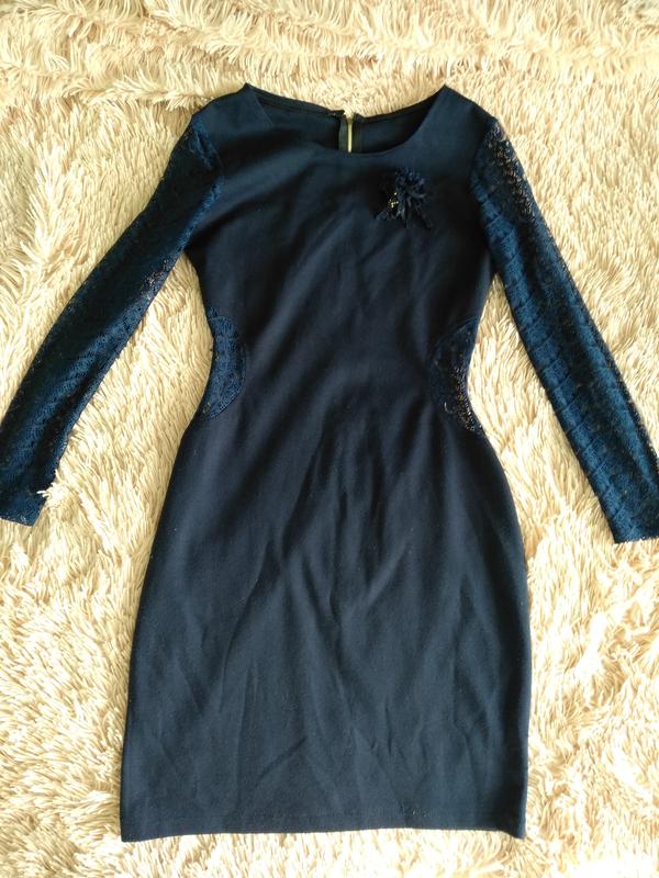 Стильне плаття з гіпюровими вставками з боків та гіпюровими рукавами.Ззаді один замочок. На платті трішки катишків