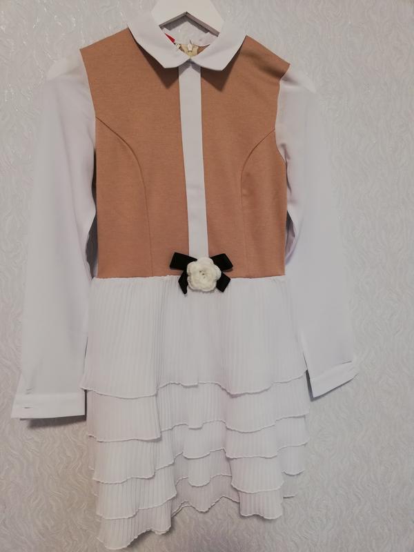 Розмір М. Сукня трикотажне з білим шифоном. Брошка знімається. Ззаду на замочку. ПІТ 35 див. ПОГ 36 см. Ширина під пахвами 39 див. Плече 10 см. Довжина рукава : зовнішній шов 59 см, внутрішній шов 49 див. Довжина 79 див.