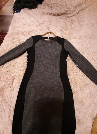Сукня по фігурі, вдала комбінація чорного і сірого, з боків чорний колір приховує недоліки фігури, якщо раптом є)). Дуже гарно сидить. Відмінно тягнеться, щільне, на весну, осінь, можна і взимку в офіс. Заміри: плечі -36 см, ПОТ-36 см, ПОГ 43 см, ПОБІДИ - 43 см, Низ - 39, Рукав - 59 см, Довжина 95 див. Фасон спідниці - олівець. Виміри зроблені в спокійному стані, тканина відмінно тягнеться!