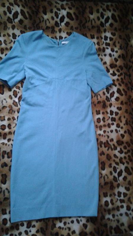 Оригинал.Красивого голубого цвета,комфортная длина-миди,под каблук смотрится отлично,в реале и на фигуре смотрится более эффектно. В идеальном состоянии,в носке один раз. По бирке размер 14,потянется на неполную 16.ткань достаточно плотная,пойдет в носку и в демисезон под шубку на корпоратив ) Длина от плеча 105,ПОГ 47,ПОТ 42,ПОБ 50,плечи 40,рукав 30.