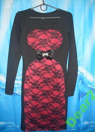 Размер 44 - но ориентируйтесь по мерочкам: В отличном состоянии ! Одевалось 1 раз. Интересное трикотажное платье ! Ткань мягкая и приятная к телу. Спереди платье декорировано черным кружевом + бантиком с брошкой. Модель красиво сидит на фигуре. Длина платья по спинке – 88 см. Ширина плеч платья – 35-37 см. Длина рукава платья – 59 см. ПОГ платья – 40-42 см. ПОТ платья – 36-38 см. ПОБ платья - 43-45 см. Дефектов нет !