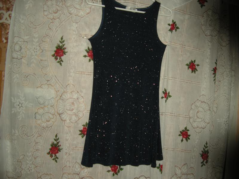 Шикарне плаття темно-синього кольору з сріблястими блискітками(на фото цю красу не видно)фірмове,натуральна,добре облягає і добре тягнеться,ошатне,об'єм грудей-78см.,об'єм талії-62cm.,довжина сукні-77см.,до низу плаття розширюється.