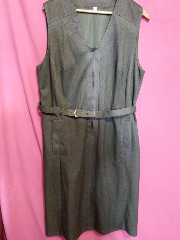 Плаття-сарафан довжина міді.По переду застібка блискавка.Два бічних кишені,пояс у наявності.Фото колір не передало.Зелено-зодоьистого кольору.Заміри довжина 114см, ПОГ-54 см,пот-49, ПОБІДИ 52см тканина трохи тягется