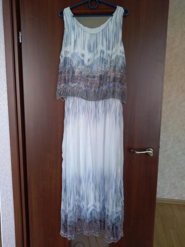 Італійське шовкову сукню білого кольору з синьо-блакитним малюнком. Підкладка натуральна, довжина максі, розмір 38. Легке, невагоме, в ньому не буде жарко в будь-яку спеку, дуже приємна до тіла. Пог 47-52, гумка 34-55, стегна вільно - 65, довжина 131.