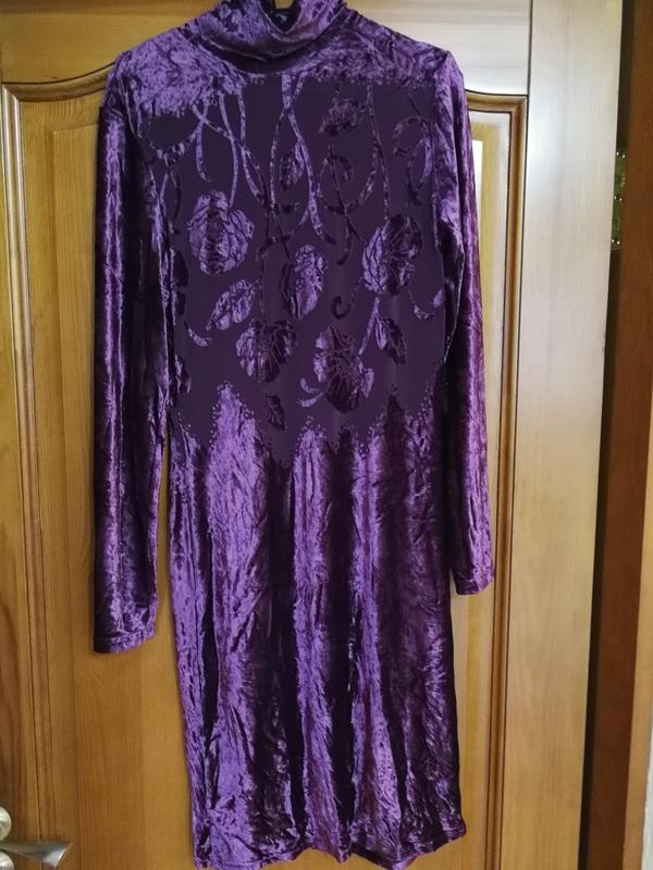 Велюрова сукня з орнаментом по центру, дуже стильна і чудово підкреслює фігуру. Попереду і ззаду на спині напівпрозора тканина у квітковій аплікації. Стан ідеальний.