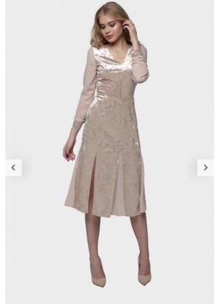 Платье из мягкой бархатной ткани, красиво переливается, рукава и вставки в юбки из полупрозрачной молочной ткани, застежка сбоку на замочек. Очень комфортное платье, классно выгодящее в динамике и на фото.