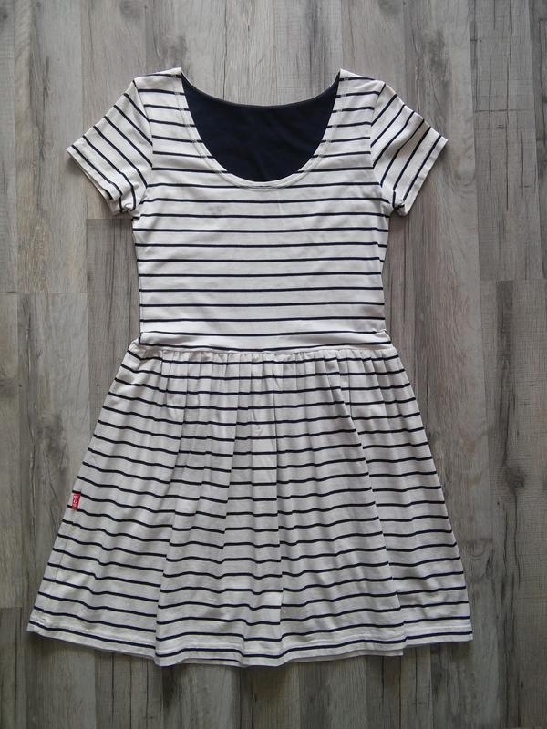 Актуальне трикотажне плаття в смужку.Довжина 80см.плечі 36-37см рукав 15см талія 37см(плаття тягнеться)
