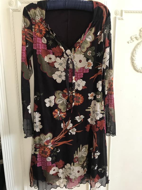 Эффектное платье длиной миди с цветочным принтом. Верхняя ткань полупрозрачная, подкладка-однотонная темно-фиолетового цвета. Длинный рукав, полуприлегающий силуэт, в зоне декольте есть кокетливая завязка. Без бирочка, отлично садится на наш 46-48.Ткань эластичная. Замеры:Длина-97 см, ПОГ-43 см, ПОБ -55 см. Очень красивое!