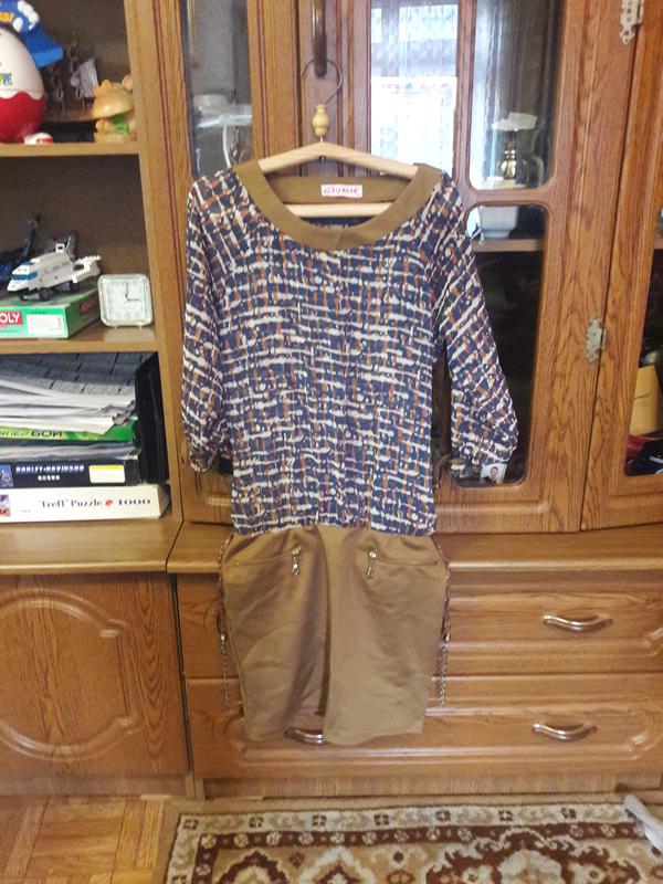 Платье горчичного цвета, под пояс, на карманах застежка змейки. Верх платье из шифона темно синего цвета. Рукав 3/4 , завязываются на бантик. Платье красивое и нарядное , типа стрейчевого.
