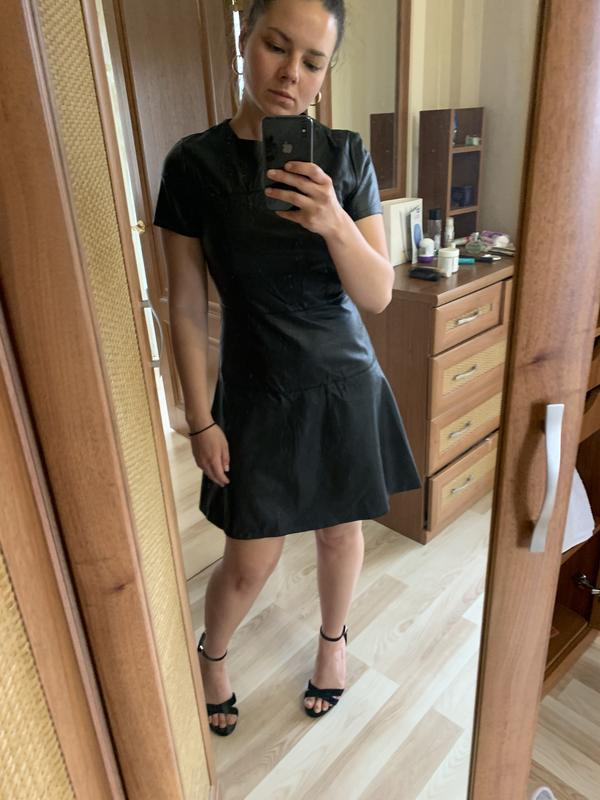 Міжі шкіряна сукня, екошкіра матеріал. Дуже круто виглядає зі щкіряним взуттям. На бірці пише хс розмір, альо за фактом на с і м підходить.