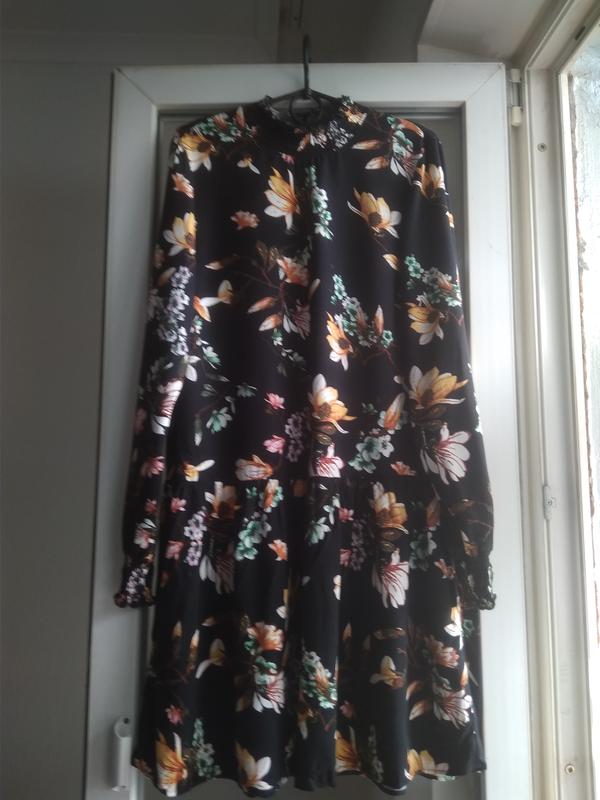 Новое! вискозное платье, в цветочный принт Рукава на широких резинка, воротник стойка Длина - 94см Ширина от подмышки к подмышки - 50см Рукава - 65см Манжеты на широкой резинке