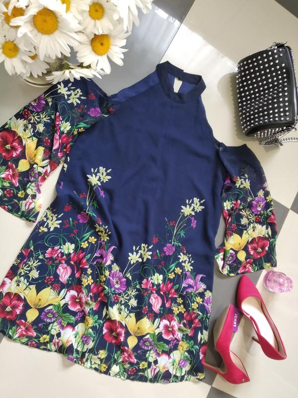 літній ошатне плаття, струмуєш шифон у квітковому принті! колір насичено синій, ширяють рукави, плечі відкриті) в ідеалі