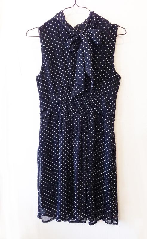 Миле, романтичне темно-синє плаття в горошок Bonprix. Збоку вшита блискавка, ззаду - невелика гумка. Є підкладка, не світиться. Стан ідеальний, в користуванні було пару раз. Розмір S-M (8). Довжина 96 див., ПОГ 50 див., ПІТ 38 див.,