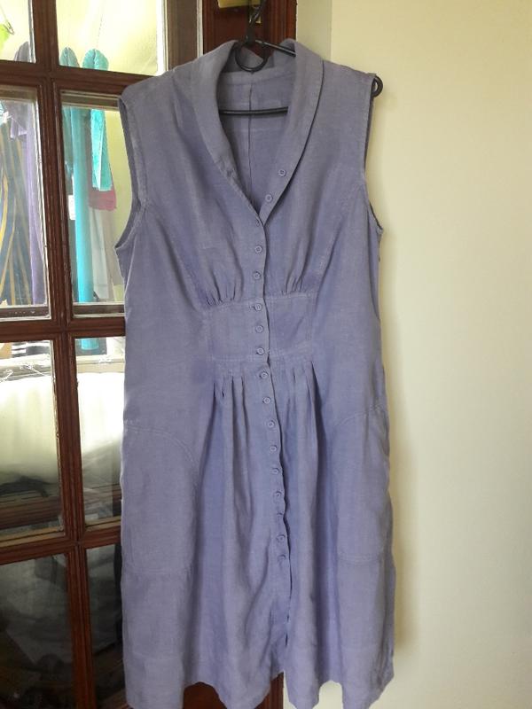 Льняное платье - халат бледно - сиреневого цвета. ПОГ 49 см, ПОТ 42 см, ПОБ 81 см, длина 103 см. Пятен нет, по подолу полоса, удлиняла платье.