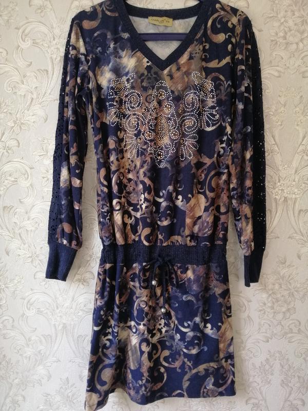 Сукня м'яке до тіла. Темно-синє. На рукова дрібні дірочки. Всі камінці на місці. В дуже хорошому стані. Довжина 90 см Довжина рукова 56 см Ширина 44 см