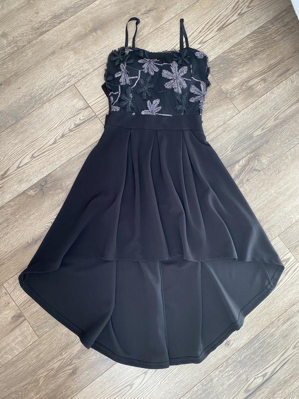 Шикарне вечірнє плаття зад довший перід коротший. На грудях є невеличкий паралон щоб одівати без бюстгальтера . Дуже гарно виглядає на фігурі . Позаду зав'язується на бант. Розмір З