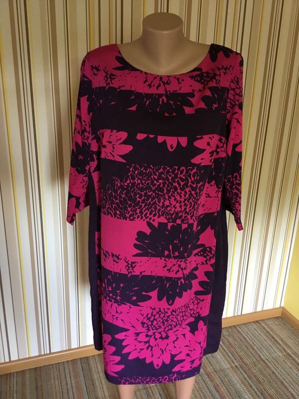 Сукня з цікавим малюнком розмір 18. На підкладці, не тягнеться. Заміри: ПоГ 57 см, ПоТ 54 см, Побіди 60 см, довжина 95, плечі 42, рукав-43. Склад: 100% поліестер