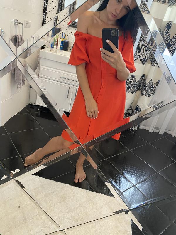 Яркого морковного цвета платье, можно опустить на плечо, выше колена, безумное
