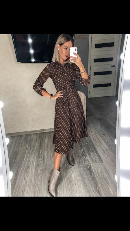В НАЯВНОСТІ🍂 Плаття Артикул: 113 evgenhevi4 Кольори: шоколад, пляшка, синій, марсала Розміри: 42-44, 46-48 Тканина: софт (95% п/е, 5% еластан) ЦІНА: 450 грн Осіннє сукня з модним у цьому сезоні горошком в наявності. Пояс із тканини в колір сукні. рукава можна носити в двох варіантах: довжина 3/4 застібаються на гудзик: розпущений рукав, довжина 53 см Довжина самого виробу 115 см в розмірі 42-44, 122 см в розмірі 46-48. Фото реал!!!