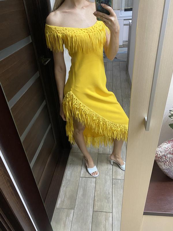 Яркое желтое платье ben de lisi с разрезом и бахромой s необычное миди