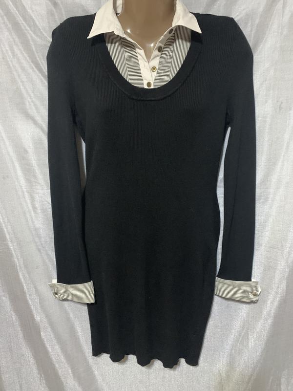 Тепла і зручна сукня в дрібний рубчик з комбінованим воротом та манжетами. Заміри: довжина - 93см., плечі - 36см., рукав - 67см., ПОГ - 44см., ПОТ - 36см., ПОБ - 41см