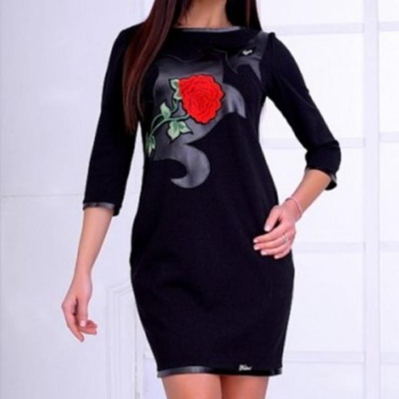 Дизайнерское платье Nikolo Polini черного цвета с аппликацией. По краям оторочено кожзамом. Застежка : скрытая молния на спине. Чуть приталеного кроя. Ткань креп-сатин. Размер 42 европейский или XL. Замеры: длина 90см., ОГ 104см., рукава 46см., талия 96см.