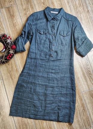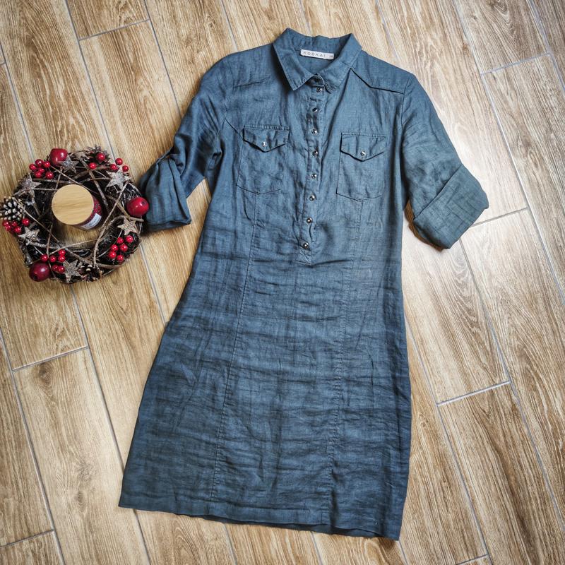 Сукня Kookai кольору хакі. Матеріал льон. Всі ґудзики розстібаються. Дуже гарно з білими кедами. Коли стала фотографувати, побачила дефекти на тканини, тому ціна символічна. В шкарпетці видно не було. Довжина 93 Рукав 60 ПОГ 49 ПІТ 41 ПОБІДИ 50,5 Облягати не повинно.