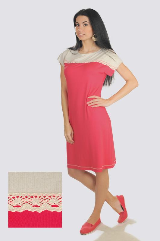 Сукня ТМ Ліла, нове, мені велике р. Л, добре тягнеться тканина, бирки на місці Модне літнє сукня комбіноване напівприлягаючого силуету, з круглою горловиною і коротким цільнокроєним рукавом. Кокетки переду і спинки виконані з віскозного трикотажу бежевого кольору. Нижня частина переду і спинки - з віскозного трикотажу малинового кольору. Лінія кокетки переду прикрашена декоративною ажурною тасьмою.