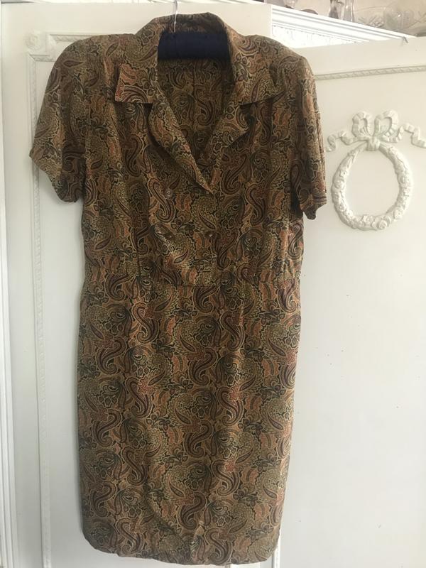 Стильне сукню ручної роботи. Красивий колір, крій:англійський комір, два ряди гудзиків, красива лінія плеча, спідниця пряма, ззаду маленький розріз, Талія на резинці, плаття на підкладки. Якщо додати будь ремінь або поясок-плаття супер! Відмінно сідає на наш 46. Заміри:довжина-97 см, ПОГ-52 см, ПОТ -43 см, ПОБІДИ -52 див.