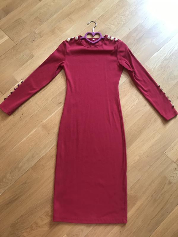 Чудова сукня червоного кольору. З красивими ґудзиками. Подовжена - 100 см від плеча. Довжина рукава 53 див. Заміри на фото. Стан новий! Пару раз мірялась альо не носилася. Тканина натуральна, по структурі ріб - добре тягнеться в ширину. Розмір S альо добре сидить і на XS, M