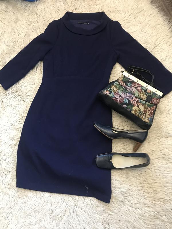 Стильне плаття довжиною міді . Красивий темно -синій{сливовий}колір. Відмінний крій:горловина -човник з невеликим коміром, красиві виточки під грудьми,рукав-3/4, , . Полуприлегщий силует. На підкладці. Склад:поліестер-66/, віскоза-30/, еластин-4/.Добре тягнеться, відмінно сідає по фігурі. Тканина досить щільна, відмінно як зимовий/осінній/весняний варіант. Розмір на бірці -38. Заміри:довжина-100см, ПОГ-45 см, ПОБІДИ -49 см, рукав-3/4. Дуже стильне і елегантне!