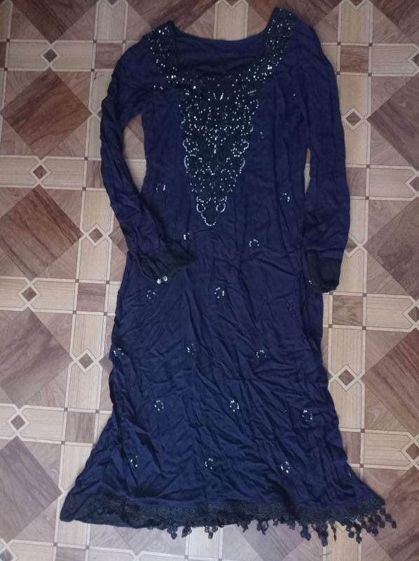 Східне сукня з розрізами з боків, перед обшитий мереживом і паетками, всередині шви неоверложены.