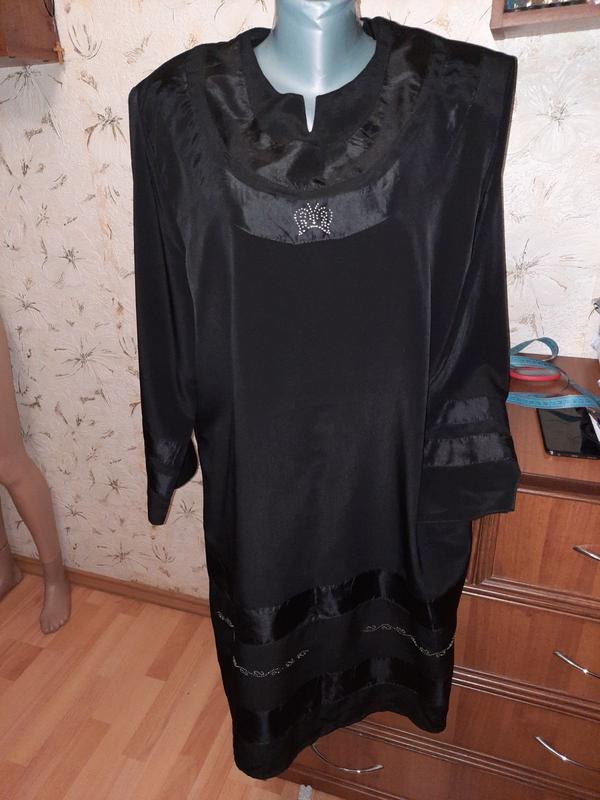 Этикетки с размером и составом ткани нет. Смотрите замеры. Ткань блузочная, как плотный шифон, не просвечивает. Цвет чёрный. Состояние очень хорошее, в некоторых местах отпали камешки. Длина от плеча к низу 105. Длина рукава от плеча 60. П/о бицепс 22. П/о груди 69. П/о талии 70. П/о бёдер 75. Ширина между плечами 46. 14.