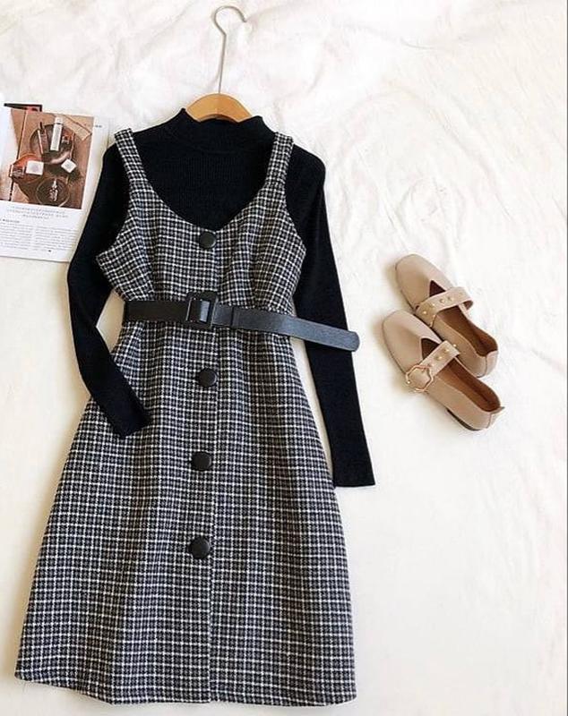 Комплект двойка с поясом💕 Мод 150 ⠀ ▪️ткань: твид и трикотаж рубчик ▪️размер единый 42-44 ▪️цвет: коричневый, черный ▪️длина: сарафан с бретелями 93 см, гольф 52 см, рукав 55 см