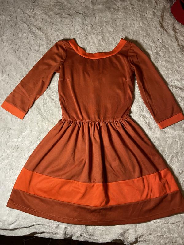Сукня темно-оранжевого кольору, зі світлими вставками. Розкльошена спідниця, розмір S. Матеріал трикотаж. Стан 5 з 5, одягала 2 рази. Ніяких пошкоджень немає.